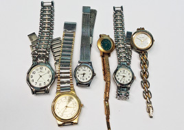 Lote de objetos em ouro, prata e outros metais, relógios, notas e moedas