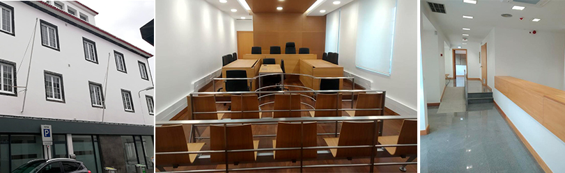 A sala de audiências foi apetrechada com novo mobiliário e equipamento de som, áudio e gravação. Tendo em conta a funcionalidade dos serviços, procedeu-se à delimitação dos espaços seguindo a linguagem existente com o aproveitamento das divisórias e introdução de novas. Os pavimentos na generalidade foram reaproveitados, designadamente os existentes em “parquet” de madeira, tendo sido revestido a vinílico nas zonas das secretarias. Foram aplicados novos tetos falsos com características acústicas nas zonas de formação e salas de audiências.